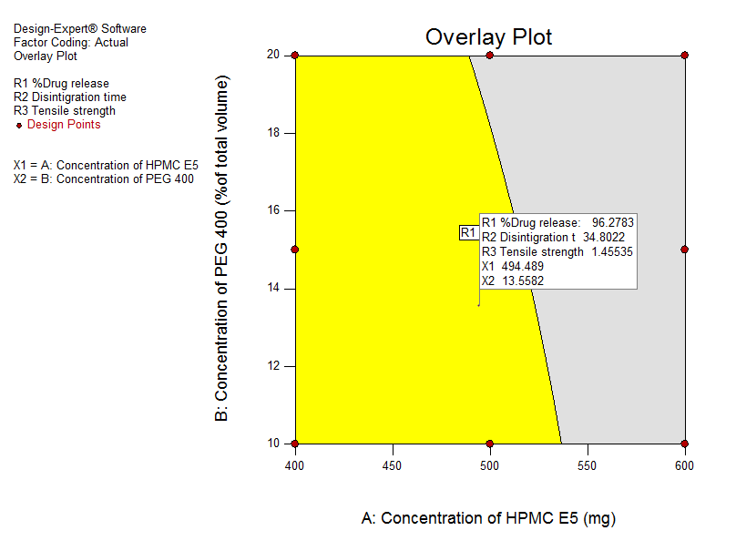 The optimized formula was selected based on criteria of maximum % drug release, minimum disintegration time and maximum tensile Strength. The overlay plot (fig. 8) was constructed to obtain optimized batch by using Design-Expert version 10. Optimized batch containing HPMC E5 (494.5 mg) and PEG 400 (13.6 mg) was prepared experimentally using the same procedure and same ingredients, which were utilized in the formulation of 32 full factorial designs. The result of % CDR, disintegration time and tensile strength was compared with that of computed values from the regression equations. When both (experimentally obtained and theoretically computed) values were compared, % error was found to be less than<5% for all responses. This endorsed utility of established contour plots and polynomial equations for all responses. Results of the optimized batch is shown in table 5.
