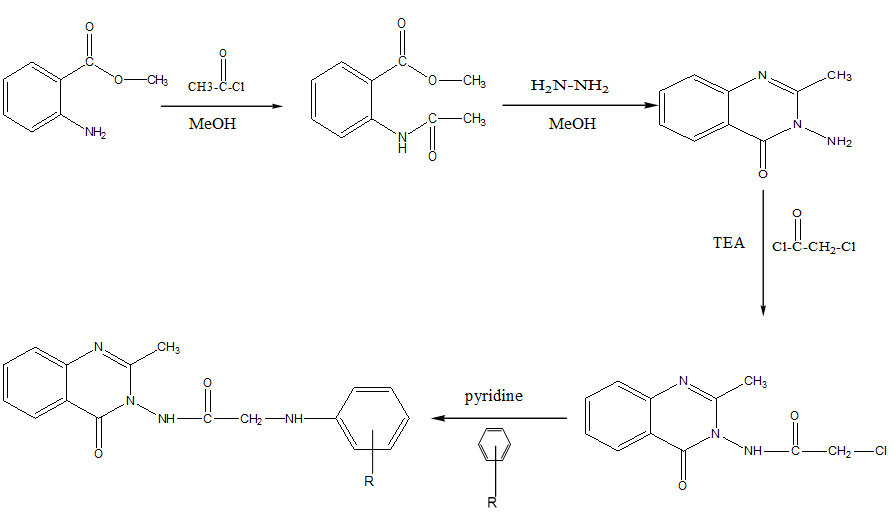 Methods: Methyl anthranilate react with acetyl chloride in ethanol gives methyl-2 acetamido benzoate (1) which on reaction with hydrazine hydrate gives 3-amino-2 methyl 4-(3H)-quinazolinone.(2) The amino group of synthesized quinazolinone with substituted acid chloride which gives 3-Chloroacetyl amino-2-methyl-4-quinazolinone (3) which on condensation with various primary amines gives 2-(2-methyl-4-oxo-4H-quinazoline-3yl-amino)-N-substituted acetamide (4a-4j).