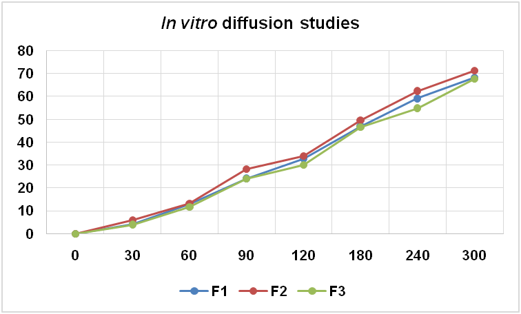 The drug release from the formulations was determined by using the apparatus, which consists of a cylindrical glass tube which was opened at both the ends. 1 gm of gel equivalent to 10 mg was spread uniformly on the surface of the cellophane membrane (previously soaked in the medium for 24 h) and was fixed to the one end of tube. The whole assembly was fixed in such a way that the lower end of tube containing gel was just touches (1-2 mm deep) the surface of diffusion medium i.e. 100 ml of pH 5.8 phosphate buffer contained in 100 ml beaker, The assembly was placed on thermostatic hot plate with magnetic stirrer and maintained at temperature 37 °±2 °C the contents were stirred using magnetic bar at 100rpm for a period of 5 h, 5 ml of samples were withdrawn at different time intervals and replace with 5 ml of fresh buffer and after suitable dilution, the sample was analyzed at 269 nm.