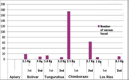 Results: With the SW method, it was obtained that Chimborazo has 23.14%; followed by Tungurahua (7.99%); Los Rios (3.24%) and finally Bolivar with (0.51%); with the HC method, it was determined that Chimborazo has the highest incidence with 9.13%; followed by Bolivar and finally Los Rios; with the CSP method, the province of Chimborazo presents the highest infestation (26250 individuals); followed by Bolivar, Tungurahua, and Los Rios. Regarding the production of eggs for each frame, 3 frames taken from the brood chamber were used in each of the apiaries under study; Chimborazo being where there is less quantity of eggs for each frame, followed by Bolivar, Tungurahua and finally Los Ríos.