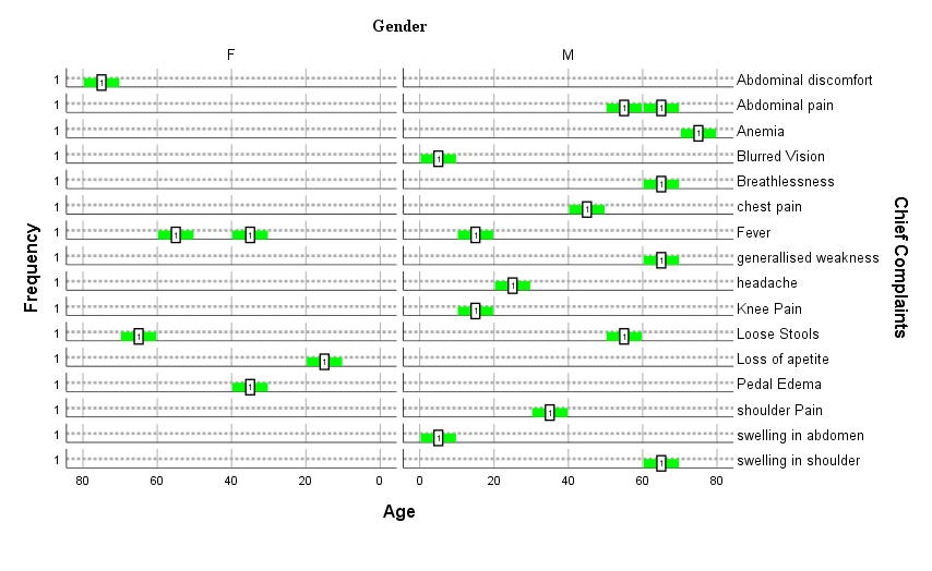 Fig. 1: The histogram describes gender. vs. age. vs. frequency of chief complaints