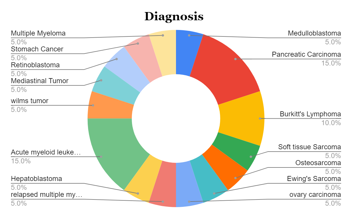 During the study period we observed very unique characteristics of each individuals, those are Pancreatic carcinoma(15%), Acute myeloid leukemia(15%), Burkitt’s lymphoma(10%), Wilms tumor(5%), Soft tissue sarcoma(5%), stomach cancer(5%), Hepatoblastoma (5%), Retinoblastoma (5%), Mediastinal tumor(5%), Relapsed multiple myeloma(5%), Medulloblastoma(5%), osteosarcoma(5%), ovary carcinoma(5%). The fig. 2 describes the how many patients are suffering from different type unique metastasis.