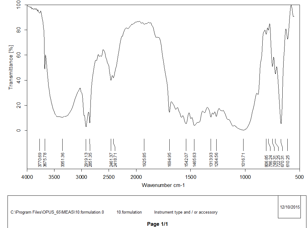 The interaction between the drug and polymer was studied by FT-IR. To produce a stable product, the drug and polymer must be compatible with one another. Drug and polymer interactions were studied by using FT-IR (Shimadzu, Japan model–8400S) as per the method. IR spectral analysis of pure donepezil hydrochloride, croscarmellose sodium, crospovidone, sodium saccharin, microcrystalline cellulose was carried out. No change in peaks of mixture compared to pure drug indicates the absence of interactions.