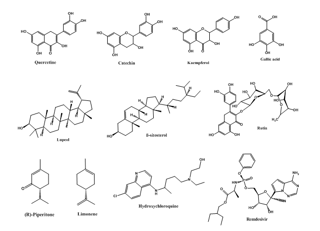 SARS-CoV-2 main protease: rutin>Catechin>kaempferol> remdesivir> quercetin>hydroxychloroquine>piperitone>gallic acid> limonene>β-Sitosterol>lupeol;
