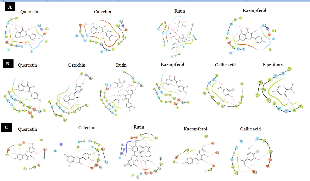 Fig. 2: 2D visualization of molecular interaction of SARS-CoV-2 main protease (A), SARS-CoV-2 receptor binding domain (B) and human furin protease (C) with the biomolecules having at least better binding energy than one reference drug (hydroxychloroquine or/and Remdesivir)