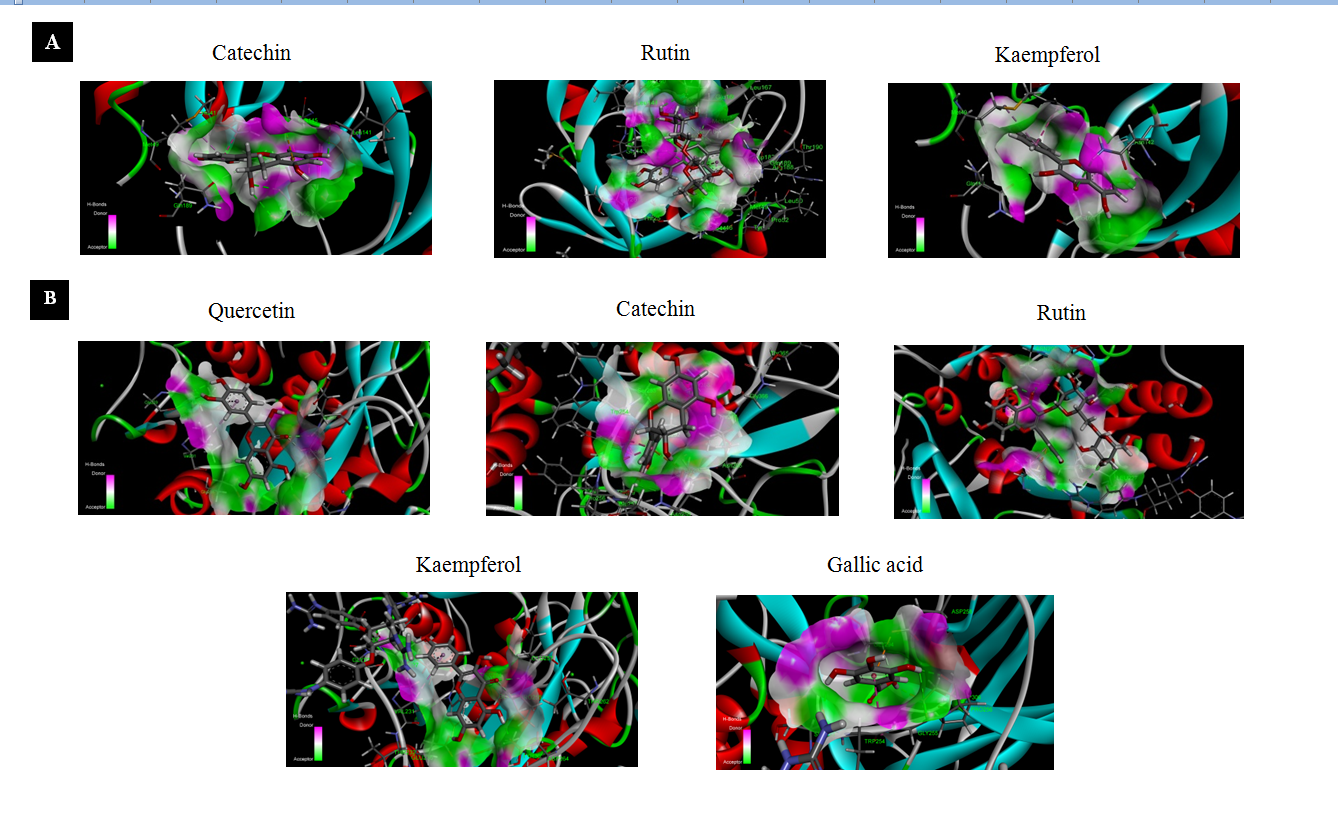 Rutin has the largest hydrogen bond with 15 H-bonds on all three targets followed by quercetin (10 H-bonds), catechin (9 H-bonds), kaempferol (9 H-bonds) and gallic acid (6 H-bonds). This high number of rutin binding is linked to its hydroxyl group richness (10 OH). Glycosylated phenolics have better docking than their corresponding aglucone [25].