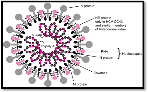 Coronaviruses are large, enveloped, positive single-stranded RNA viruses. They have a genome ranging from 27 to 32 kb, which is largest genome among all RNA viruses. The genome is arranged as a packed helical capsid formed by the nucleocapsid protein (N) which is then surrounded by an envelope. There are three structural proteins associated with viral envelope which are: The membrane protein (M) and the envelope protein (E) are involved in virus assembly, and the spike protein (S) mediates virus entry into host cells. The viral envelope is composed of a lipid bilayer where the membrane (M), envelope (E) and spike (S) structural proteins are anchored. A subset of coronaviruses (specially the members of beta coronavirus subgroup A) are known to have a shorter spike like surface protein known as haemagglutinin esterase (HE).