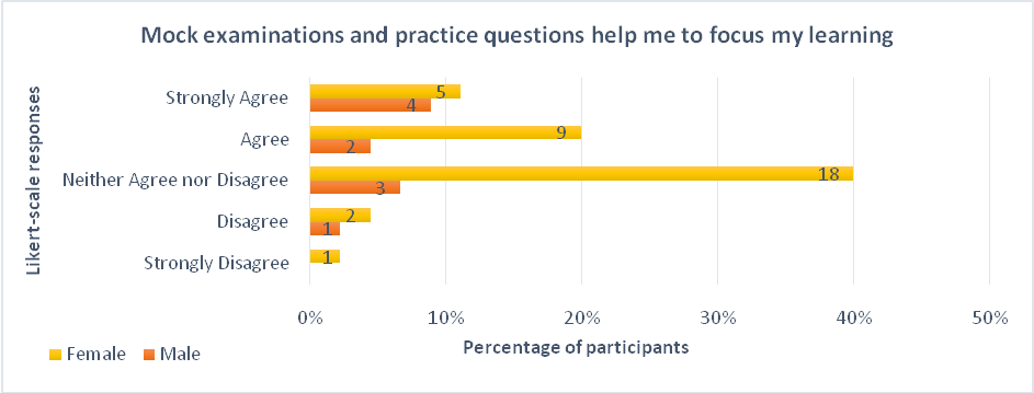 Fig. 2: Responses by gender on the effect on learning focus when mock questions are used