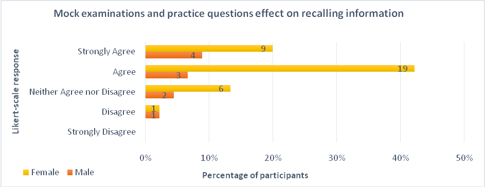 Of all participants 91% (97% of females, 69% of males) had access to mock questions. Participants from all age groups had access to mock questions with only 9% (four of the 21-23 y olds and one of the 24-26 y olds groups) did not. Participants were then asked to indicate the source(s), where 43% indicated that the ‘lecturers provided them’, 22.5% said ‘from Canvas’ (The University of Wolverhampton online learning platform), 4% said ‘from textbooks’ and 4% said they received it from their ‘peers'. There were 18.5% incorrect responses as participants gave examples of examinations, they used mock questions for instead of the source, and a further 9% participants did not answer the question.