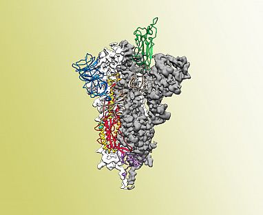 Fig. 3: Atomic-level structure of the SARS-CoV-2 spike protein. The receptor-binding domain, the part of the spike that binds to the host cell, is colored green