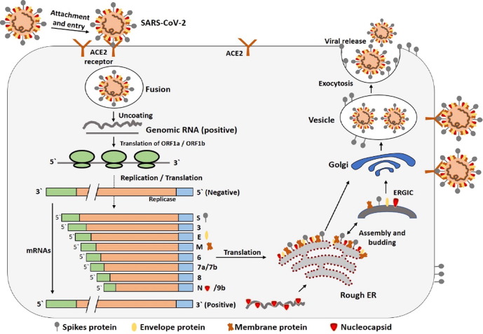 The life cycle of SARS-CoV-2 in host cells; begins when S protein binds to the cellular receptor ACE2. Once receptor binding, the conformation modification within the S protein facilitates viral envelope fusion with the cytomembrane through the endosomal pathway. Then SARS-CoV-2 releases RNA into the host cell. Genome RNA is translated into viral replicase polyproteins pp1a and 1ab, which are then cleaved into little products by viral proteinases. The polymerase produces a series of subgenomic mRNAs by discontinuous transcription, and at last translated into relevant viral proteins. Viral proteins and genome RNA are subsequently assembled into virions within the ER and Golgi and so transported via vesicles and discharged out of the cell. ACE2, angiotensin-converting enzyme 2; ER, endoplasmic reticulum; ERGIC, ER–Golgi intermediate compartment [9].