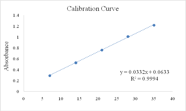 From stock Solution (7, 14, 21, 28, 35) µg/ml solutions were prepared by diluting aliquots of (0.7, 1.4, 2.1, 2.8, 3.5) ml in methanol and volume was made up to the mark using methanol.
