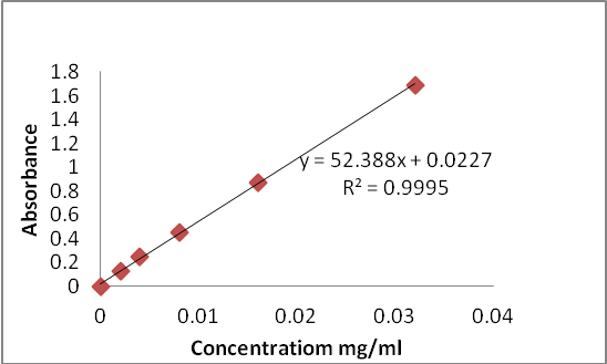 Metformin HCl standard curve can be obtained such that by dissolving 10 milligrams metformin HCl powder, a stock solution was made wherein 50 ml d/w and agitation that for several minutes until 100 ml is obtained with a phosphate buffer with a pH of 7.4. Dilutions, 0.032, 0.0160, 0.0080, 0.0040, and 0.0020 mg/ml were shaped from solution. All the dilutions were assessed for absorptions on 242 nm through Ultraviolet-visible spectrophotometer type-1601 Shimadzu, Japan. Fig. 2 shows the linearity graph of this finding [4].