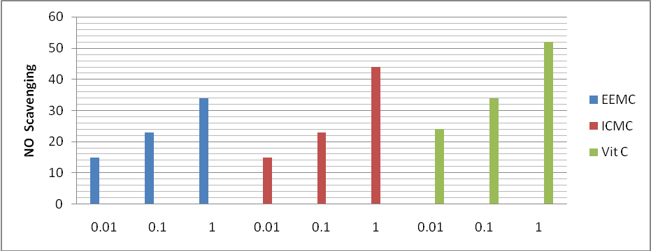 | Concentration in µg/ml | NO Scavenging by Vit C | NO Scavenging by EEMC | NO Scavenging by ICMC |