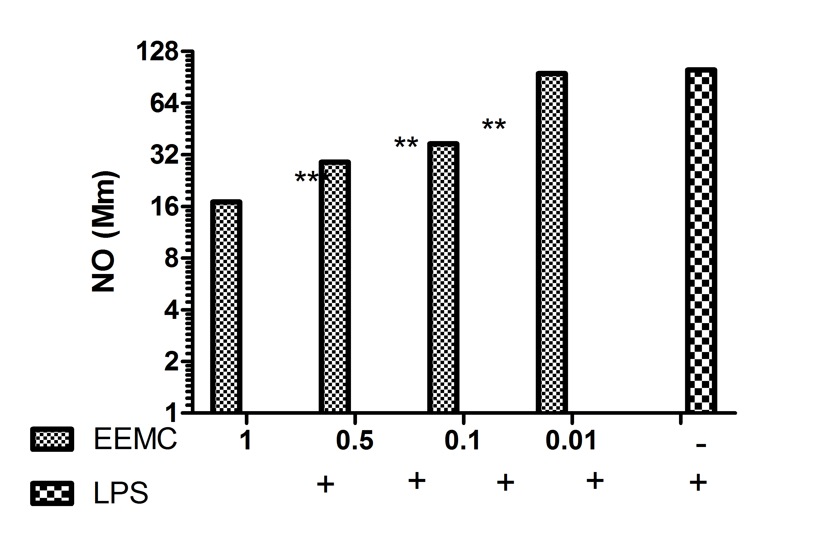 Inhibition of NO production by the M concanensis ethanolic extract and isolated compound. Data are mean±SEM (n = 3); **p<0.01.