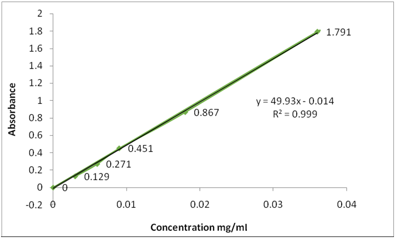 To establish Celecoxib standard curve, a solution in stock was come about in 10 mg of Celecoxib powder, dissolved in ethanol (50 ml) through the stirring of multiple minutes and accomplishing 100 ml volume in ethanol further diluted in phosphate buffer contains (pH 7.4). From the stock solution, dilutions were made as 0.003, 0.006, 0.009, 0.018 and 0.036 mg/ml. At 250 nm, ultraviolet (UV)-visible spectrophotometer (Shimadzu UV-1601, Japan) was employed and absorbance of entire dilutions were analyzed. The graph for linearity is delineated in fig. 2.