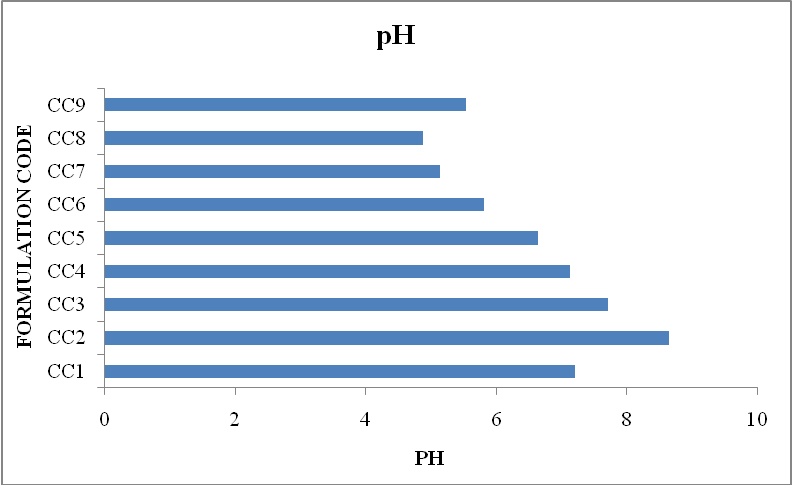 The result of pH of prepared creams (CC1–CC9) was found to be around 6 which are suitablefor topical application. Because skin pH in between 4.5-6.