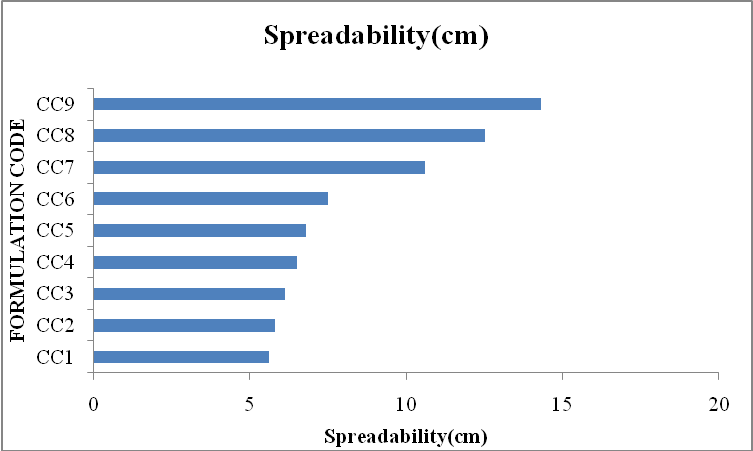 Spreadability of cream formulations, that is, the ability of a formulated cream to evenly spread on the skin plays an important role. Formulations CC6, CC5 were good spreadability properties. CC7-CC9 Formulations have leaking and overspreading occurred.