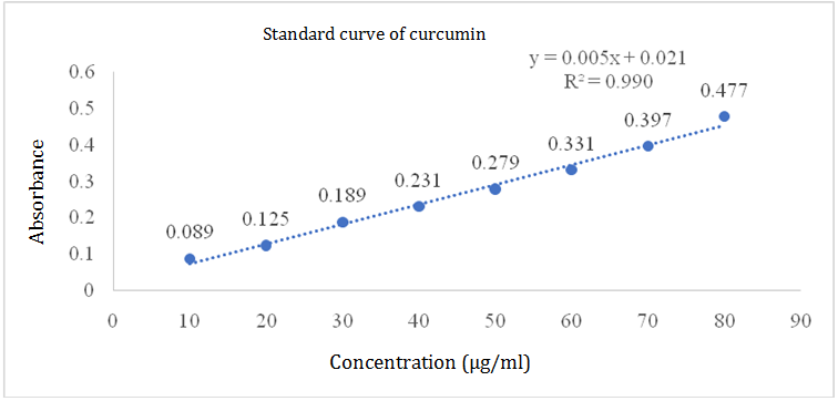 Free curcumin was dissolved in acetone (1 mg/ml and prepared the stock. From the stock various working concentration were prepared like 10, 20, 30, 40, 50, 60, 70, 80 µg/ml. λ max was determined by scanning drug solution in the range of 200-800 nm in the UV-vis instrument. After that all the working solutions were scanned in the obtained λ max (fig. 1) [15].