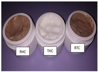 Two beakers were taken to prepare the oil phase and water phase. The oil phase was prepared by melting the waxes at 80 °C and uniform mixing of the ingredients. The water phase was prepared with water soluble ingredients dissolved in deionized water till 75-80 °C until all the ingredients dissolved. Tea tree oil was added in the oil phase and reishi extract was added in the water phase according to their respective formulations. After mixing well water phase was poured in the oil phase with moderate agitation and was kept stirred until the temperature dropped to 40 °C. Methylparaben and Propylparaben were dissolved in warm deionized water and the solution was added to the base. The volume was made up with water. The emulsion was cooled at room temperature to form a semisolid cream base. The mixture was stirred until the formulation became uniform till 15 min. The formulation charts are shown in table 1. Creams with the active ingredients are shown in fig. 1.