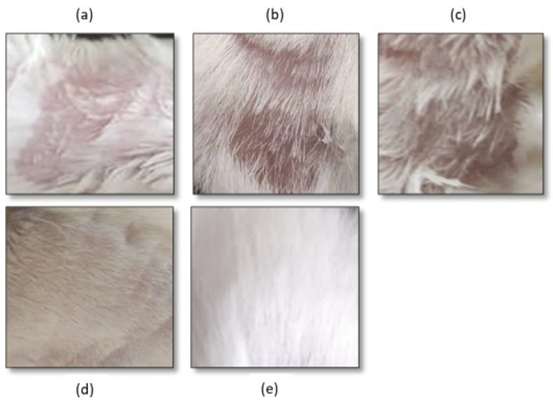 Fig. 2: Visual evaluation of hair growth inhibition, (a. Standard group, b. THC, c. RTC, d. RHC, d. Control)