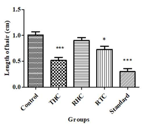 According to our data of morphometrical analysis for the length of hair, we found our standard and THC to be significant at p<0.001, RTC to be significant at P<0.05 and RHC was found to be insignificant at P<0.05. It indicates more delayed and reduced hair growth in the group treated with standard and THC whereas it was reversed in the case of RHC. Hence the RHC was not found to be that much effective against hirsutism and THC was found to be the most effective one.