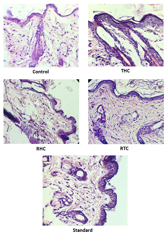Fig. 4 demonstrates the qualitative analysis of horizontal and vertical sections of the skin and hair follicle treated with RHC revealed a mild reduction in the size of the hair follicle with reduction of sebaceous gland size as compared with the control group which showed the presence of normal epidermis, dermis, adnexal structures and presence of normal hair follicle. RTC and THC showed mild to moderate reduction in the size of the hair follicles with a reduction of sebaceous gland size. Finally, the skin treated with standard showed a moderate reduction in the size of the hair follicles with a reduction of sebaceous gland size as compared with the control group. Mild to moderate reduction in the size of follicles in the group treated with THC and RTC as compared to the control group indicates delayed follicular development. This relates to a decrease in the diameter of the hair shaft resulting in slower hair growth, softer and lighter hair shafts [13]. Though we do not have the exact measurements of hair follicles diameter, it was done qualitatively.
