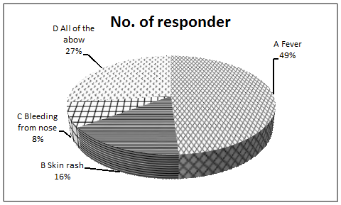 Following related survey were depicted to compare the finding of our study results. Knowledge, attitude and practice regarding dengue among people in Pakse Laos. This was a cross-sectional study conducted in nine villages of Pakse district in Champ sack Province during July to September 2006. The study population included people who had suffered From DF and/or were treated within less than two years. Almost all of the respondents were diagnosed from both symptoms and laboratory tests from the hospital. Persons who had not suffered from DF were excluded from the survey. The data were collected by a face-to-face interview with residents of households with a history of DF. The socio-demographic characteristics of these responders, among 230 eligible persons interviewed, 161 (70.9%) were female and 69 (30.0%) were male About 46.5% of them were in age group 31–45 y, followed by 36.5% in the 15–30 y age group. Among them 223 (97.0%) were Buddhist, and only 7 (3.0%) were Catholic. Among the Respondents, 81 (35.2%) were in a preliminary school. Sixteen (7.0%) had received a college [14]. Outlook of dengue in Malaysia: Method-A cross-sectional study of dengue in peoples in gombae district, Malaysia Ariffin F., Ramlia S., Recognizing Life-threatening feature of dengue in peoples. It is cross sectional study involving old women and men as well as younger. Knowledge on life-threatening symptoms, Knowledge of dengue and attitude of the peoples amongst dengue were collected using self-administered questions. The total responders were 866, with 44.8% men and 55.2% women. The Knowledge score of dengue among responders was 800 (30.6%) to average (56.8%). It was observed that 600(27.5%) to average 46.3% responders have a positive attitude towards the dengue [15].
