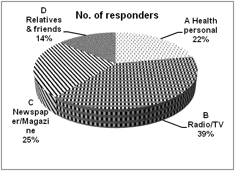 | 4 | What are the sources of information? | a) Health personal b)Radio/TV c) Newspaper/Magazine d) Relatives and Friends (Any one or more) |