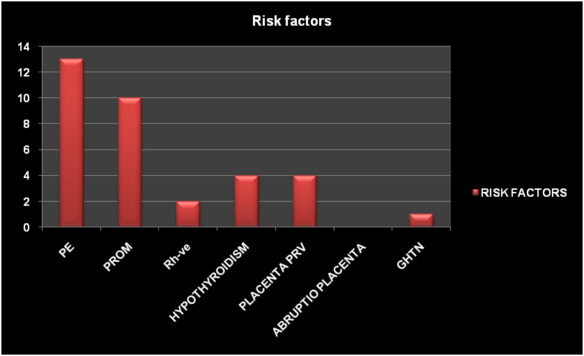 Risk factor with severity of anemia was studied and it shows that majority of participants with severe anemia had preeclampsia followed by premature rupture of membrane. Minor risk factor developed in this study is Rh-ve 13 participants with severe anemia and 42 participants with moderate anemia shows low birth weight of less than 2.5 kg.