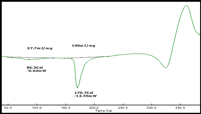 DSC (Shimadzu 60H, Tokyo) analysis of optimized formulation and pure drug are studied for the molecular state of the compound. DSC curves help in deducing heat of fusion and melting point. Approximately 5±2 mg of sample is taken in a sealed pan (hermetically) made of aluminum and gradually exposed to a temperature at 10 °C. min-1 heating rate from 20 °–300 °C under gas (N2) flow at a constant rate of 30 ml. min-1.