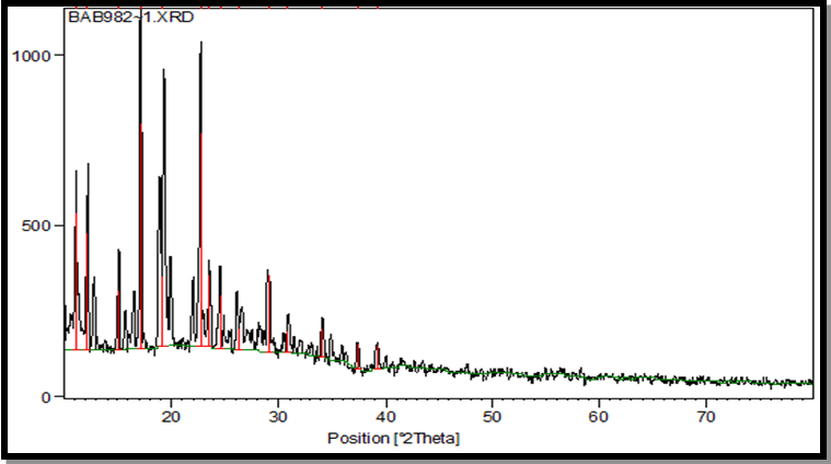 The PXRD (Shimadzu 7000, Tokyo) repeated format for both drugs and most effective powder formulations are received at a voltage of 45kilovolts; when a beam of Cu Kα radiation, generated from 40milliAmperes current moves forward through Ni filtered monochromator made up of graphite onto the detector. All samples were run at 1° (2θ) min-1 from 3° to 45° (2θ).