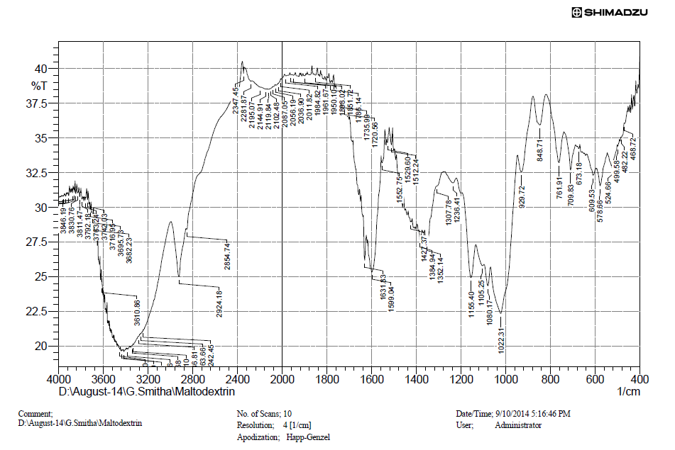 IR spectra of drug, best powder formulation and excipients such as maltodextrin are acquired from FT-IR spectrophotometer (Shimadzu 8400S, Japan) at a scanning range of 4000–400 cm-1 with a resolution of 4 cm-1 to study the drug-excipient interactions. The sample for which is prepared following the potassium bromide (KBr pellet) procedure.