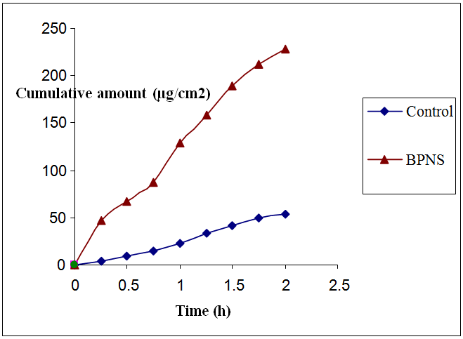 The amount of drug permeated from proniosomal systems for bazedoxifene acetate has enhanced when compared with respective control within a period of 2 h as shown in the graphical image of fig. 8. The flux values also improved for proniosomal system when compared with control. The ER above 1 shows enhanced permeation of proniosome when compared with control.