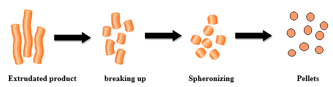 A uniform powder mixture of all the ingredients by the addition of distilled water. The dough was then passed through the extruder (1.5 mm) (Shakti) at 50 rpm for 5-10 min to form cylindrical extrudates, which were subsequently broken into smaller cylindrical rods and rounded in to spherical pellets by means of fast rotating friction plates in spheronizer at 800–900 rpm for 40 min and finally dried at 40 °C for 2 h [20].