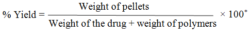 Percentage yield: The yield was determined by weighing the drug-loaded pellets and then finding out the percentage yield with respect to weight of input material i.e., the weight of drug and polymer used. Percentage yield is determined by using the mentioned formula [21].