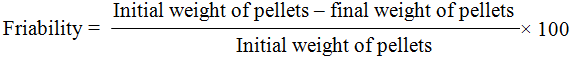Accurately weighed sample (5 g pellets) was placed in the drum of Electrolab friabilator (USP XXIII) and rotated for 100 times. The sample was removed, sieved to remove broken pellets and weighed accurately to determine the percentage weight loss of pellets [23].