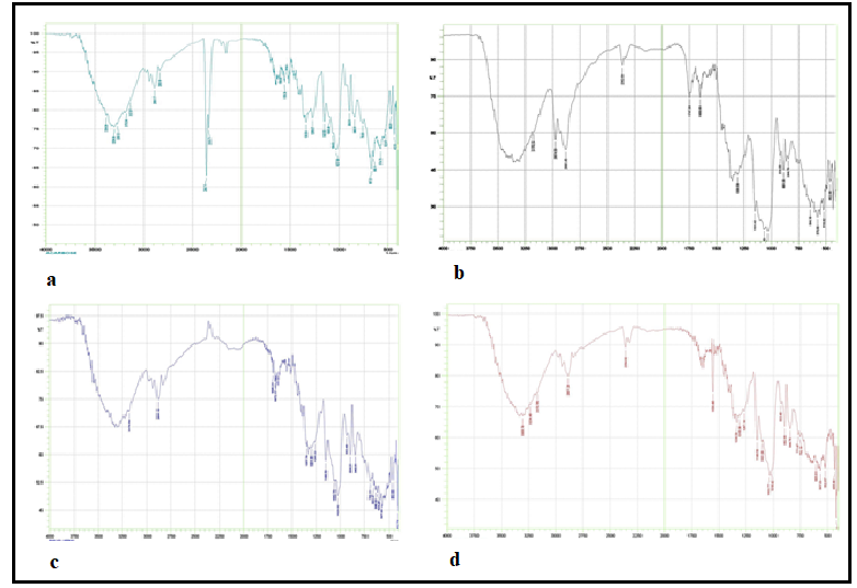 Fig. 2: FTIR spectra of a) Acarbose, b) Acarbose and EC, c) Acarbose and chitosan, d) Acarbose and HPMC K4M