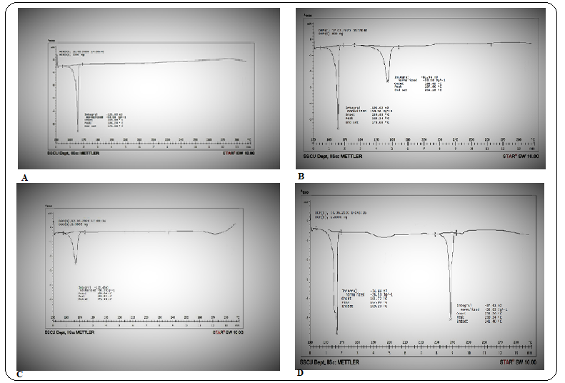 Fig. 3: DSC Thermogram of A) Acarbose B) Acarbose+EC C) Acarbose+HPMC K4M D) Acarbose+chitosan
