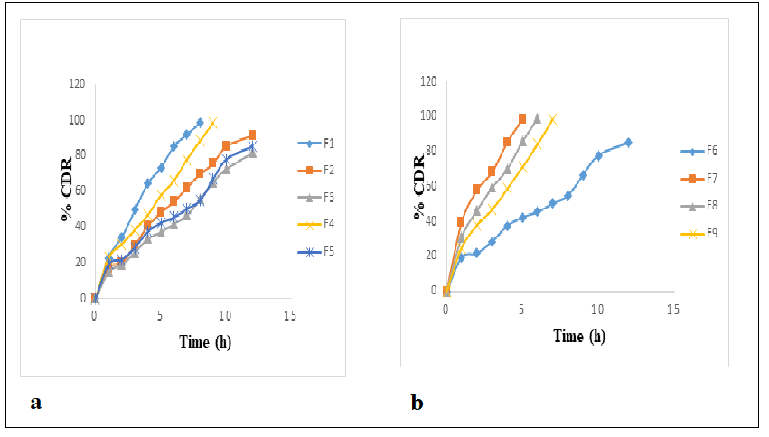 Fig. 4: a) Cumulative drug release data of F1-F5b) Cumulative drug release data of F1-F5
