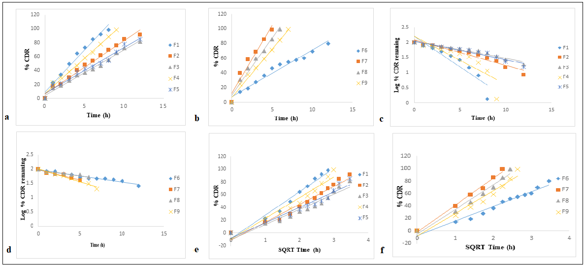 Fig. 5: a) Zero-order release kinetics of F1-F5 b) Zero-order release kinetics of F6-F9, c) First order release kinetics of F1-F5 d) First order release kinetics of F6-F9, e) Higuchi plot of F1-F5 f) Higuchi plot of F5-F9