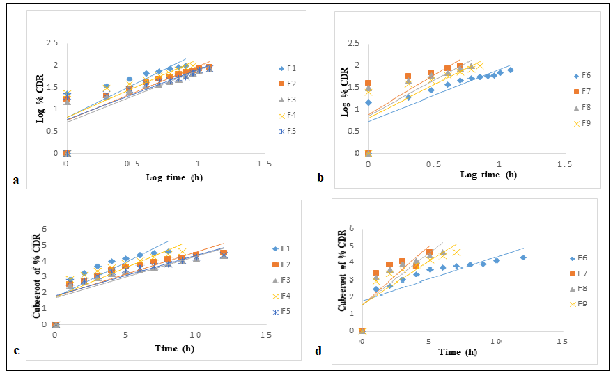 Fig. 6: a) Korsmeyer peppas plot of F1-F5 b) Korsmeyer peppas plot of F6-F9, c) Hixson crowell plot of F1-F5 d) Hixson crowell plot of F6-F9