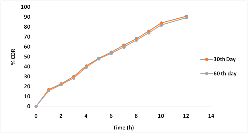 A stability study is important method to develop a new product and establish the shelf-life of a product. Stability testing studies shows that a pharmaceutical product can be stored at normal and accelerated conditions without any degradation. Stability studies were carried out for the most satisfactory formulation F2 at 40±2 °C/75±5%RH for two months after the first month and second-month samples were evaluated for drug content and in vitro drug release. On the basis of stability data it concluded that there were no significant changes in result obtained during stability studies, thus indicating that formulation is stable under specified temperature and humidity condition. The results are shown in (fig. 8).