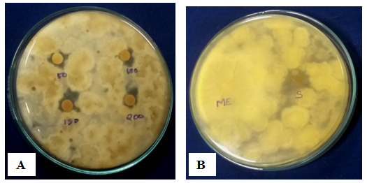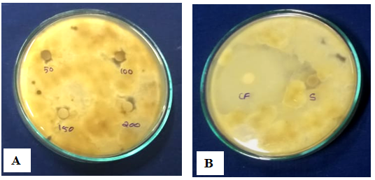 Fig. 11: (A) Gliocladium roseum mycelial mat extract silver nanoparticles against Cladosporium cladosporioides (B) Control