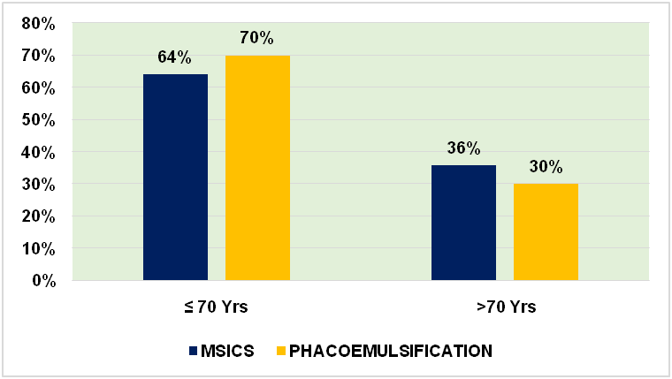 In this study it was observed that 64% of MSICS patients and 70% of patients undergoing phacoemulsification were under 70 y of age (fig. 1).