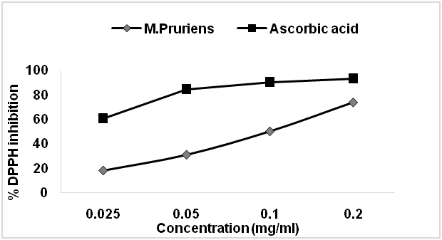 Mucuna pruriens seed extract showed DPPH radical scavenging activity of 18.24 %, 31.13%, 50.27% and of 72.95% at different concentrations of 0.025 mg/ml, 0.05 mg/ml, 0.1 mg/ml and 0.2 mg/ml respectively. The corresponding percentage of DPPH radical scavenging activity of reference control ascorbic acid were 60.79%,84.65%, 90.41% and 93.24%. Showed a maximum activity of 93.24% at the same concentration (table 2). A significant percentage inhibition of DPPH by mucuna Pruriens seed extract (72.95) was observed at the highest concentration of 0.2 mg/ml as represented in the fig. 1.