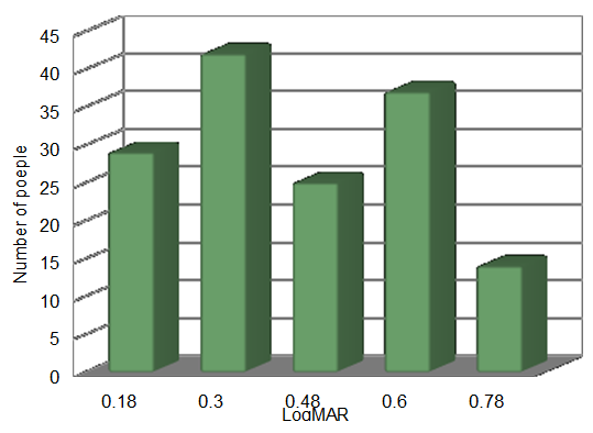 Visual acuity was measured using snellen chart and the data was collected using Feet as units and was converted into standard LogMAR (Mean Angle of Resolution) for convinience. In fig. 2 the x-axis represents LogMAR and the y-axis refers to the number of people in each scale. It is seen that 31% of the patients with dry eyes have moderate visual impairment proving that there is an effect of dry eyes on visual acuity.