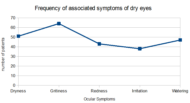 Patients with dry eyes in addition to visual impairment, come with other complaints of some associated ocular symptoms. This includes dryness, redness, grittiness, irritation and lacrimation, which was represented along the x-axis in the fig. 3 and the number of people suffering from each symptom was represented along the y-axis. Dryness and Grittiness seems to be the most common ocular symptoms among the patients in this study.