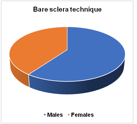 All the patients were operated on under local anesthesia after cleaning the eye thoroughly with 7.5% of betadine solution i.e. povidone-iodine solution. A peribulbar block was given with local anesthesia of 2% lidocaine and 0.1% bupivacaine. In bare sclera technique, the pterygium is removed by holding the body of pterygium with toothed forceps and separated along with the tenon's capsule with the help of D blade. Care is taken so that not to damage the medial rectus muscle. The bare sclera is left to heal. In the conjunctival autograft technique, the bare sclera is covered with a graft taken from the superior part of the sclera based on the measurements. The autograft is then sutured.