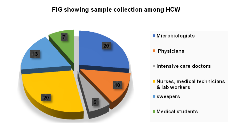 The study included a total of 75 samples from mobile phones and finger prints of both hands of HCWs i.e., 20 microbiologists, 10 physicians, 5 intensive care doctors, 20 nurses, medical technicians and lab workers, 13 sweepers and 7 medical students aged from 20 to 60.